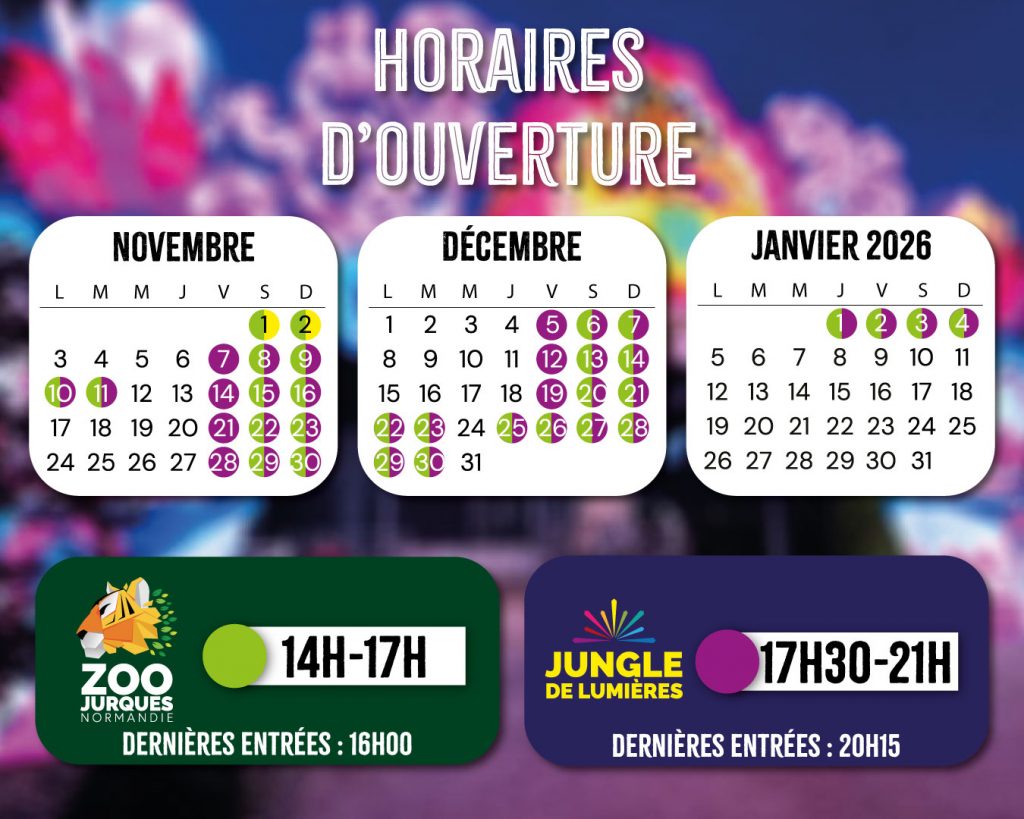 Le calendrier ci-joint prĂ©cise les jours d’ouverture du zoo (en vert) et de la Jungle de LumiĂšres (en violet).